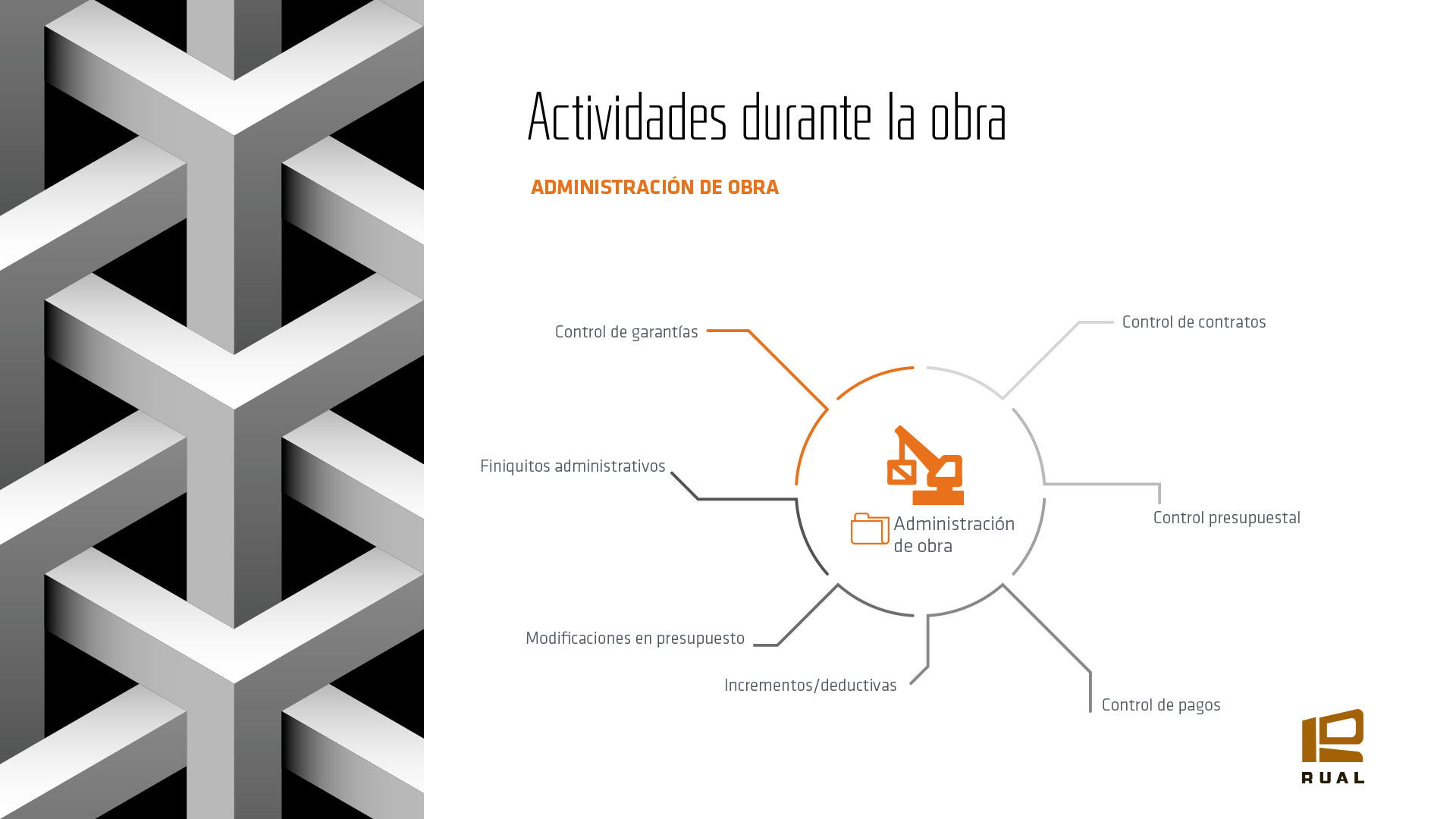 RUAL, no es responsable de hacer los diseños, no construye, no es proveedor, no financia, no opera ni vende inmuebles, RUAL ofrece tomar la responsabilidad de representar a los propietarios técnica y administrativamente, ante todos aquellos elementos que se deben conjugar para realizar un proyecto de construcción, desde la idea preliminar del mismo hasta la entrega a los usuarios finales de dicho proyecto. RUAL ofrece a los propietarios los servicios profesionales integrados de Gerencia de proyecto; las actividades que realiza son las siguientes: